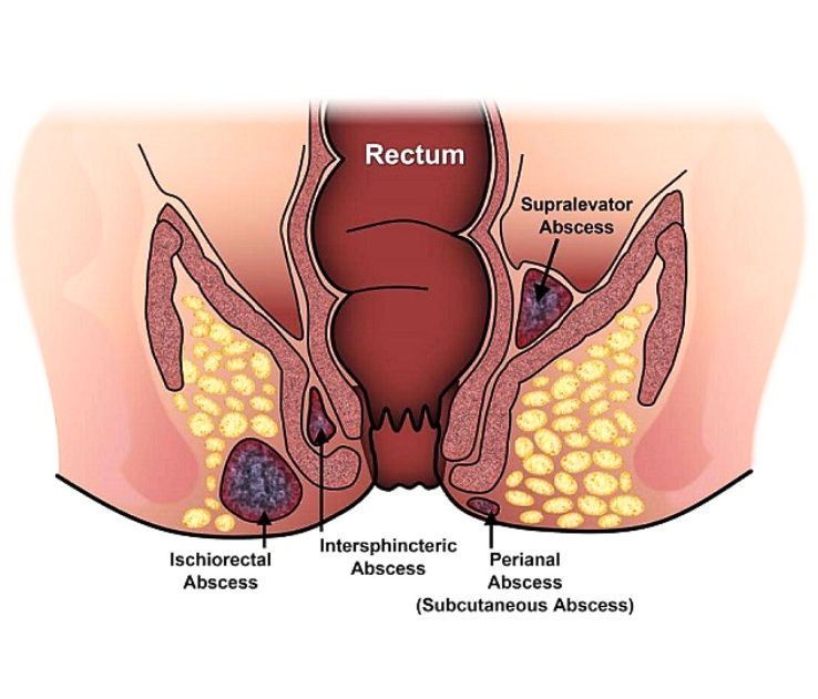 • Anal Abscess: An anal abscess is a localized collection of pus that forms in the tissues around the anus or rectum. Abscesses usually occur due to bacterial infection, often resulting from an obstructed anal gland.